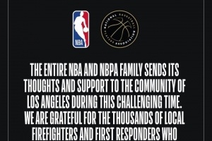 NBA官方在一则声明中表示:整个NBA和球员工会大家庭在这个艰难时刻向洛杉矶社区表达我们的关心和支持。我们感谢成千上万的当地消防员和急救人员,他们表现出了巨大的勇气,我们为那些遭受山火造成的难以想象的破坏的人们祈祷。
