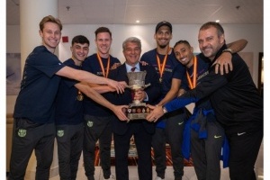 巴萨更新社媒动态,晒出主席拉波尔塔、主帅弗里克、队长们与奖杯的合照,配文:“这座奖杯是献给你们的,巴萨球迷!”