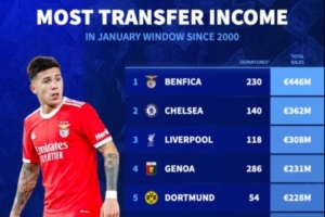 体育资讯1月14日讯 不久前,德国转会市场晒出了21世纪在冬窗卖人赚钱最多的球队排行榜,本菲卡高居第一,切尔西和利物浦排在二三位,所有交易也包括了租借转出。