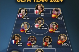 体育资讯1月16日讯 IFFHS(国际足球历史和统计联合会)公布欧足联年度最佳阵容,贝林厄姆、罗德里在列,哈兰德、凯恩、亚马尔三叉戟。