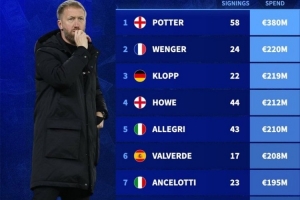 体育资讯1月16日讯 德国转会市场盘点了21世纪足球主教练的冬窗引援数量,西汉姆主帅波特一共在冬窗签下过58名球员,总花费3.8亿欧元,两项数据都断层领先。