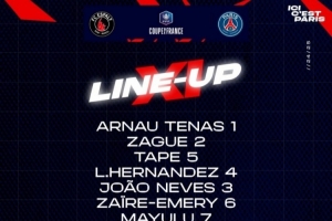 巴黎圣日耳曼首发:特纳斯、扎格、塔佩、卢卡斯-埃尔南德斯、若奥-内维斯、埃梅里、马尤卢、法比安、巴尔科拉、贡萨洛-拉莫斯、杜埃