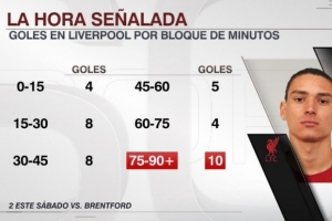 体育资讯1月19日讯 英超第22轮,努涅斯补时梅开二度,帮助利物浦2-0绝杀布伦特福德。据统计,在红军生涯中,75分钟过后也是努涅斯进球最多的时间段。