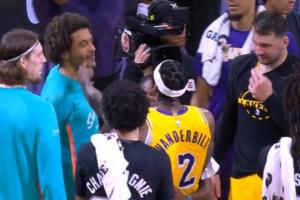 体育资讯1月8日讯 NBA常规赛,湖人91-107不敌马刺。赛后,湖人球员范德比尔特和马刺球员索汉之间发生了冲突。