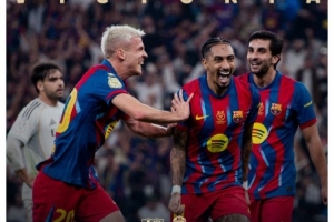 体育资讯1月12日讯 西超杯决赛,巴萨3-2击败皇马,夺得冠军。