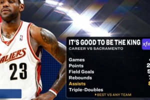 其中,场均8.5次助攻是詹姆斯对阵所有球队中最高的。