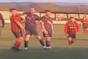 特里亚德湾的汤姆·泰勒在对方即将主罚点球时,用肘部击打了对方球员面部。事发后,泰勒已被俱乐部解约。同时,北威尔士警方证实,一名35岁的男子已被逮捕。