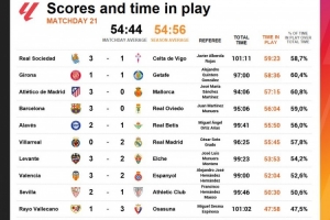 西甲第21轮没有任何一场比赛净时间达到60分钟,场均仅为54分44秒