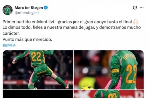 特尔施特根社媒晒出比赛照片,并写道:“我在蒙蒂利维的首场比赛,感谢大家一直到最后的全力支持。”