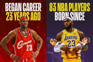 据统计,目前NBA中有83名球员在勒布朗·詹姆斯于2003年10月30日完成职业生涯首秀时甚至还没有出生。