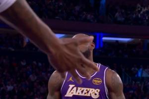 阿努诺比篮下没人管!暴扣!詹姆斯摊手沮丧。
