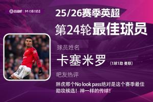 卡塞米罗最终得到了吧友们54405张投票,当选【体育资讯X咪咕体育英超第24轮最佳球员】。