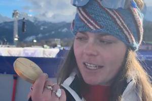 体育资讯02月09日讯 美国选手布丽兹·约翰逊夺得米兰冬奥会高山滑雪女子滑降金牌,赛后布丽兹·约翰逊的金牌和绶带的连接处损坏。