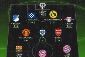 后卫:曹法尔(霍芬海姆,7.13分)、武什科维奇(汉堡,7.26分)、施洛特贝克(多特蒙德,7.30分)、劳姆(莱比锡,7.39分)