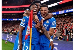 比赛第二天早上,皇马官方社媒发布第一条动态,晒出维尼修斯、姆巴佩、琼阿梅尼拥抱庆祝的照片,并配上了蓝色心形表情符号。