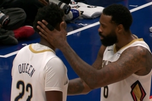 GIF-德拉蒙德防守中推奎因 后者推回去险引发冲突 判罚看回放吹罚德拉蒙德技术犯规