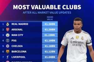 俱乐部德转身价排名:皇马13.8亿欧居首,前15名英超球队占8席
