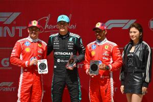 体育资讯03月14日讯 2026赛季F1中国大奖赛冲刺赛今日11:00在上海国际赛车场进行,拉塞尔夺冠!勒克莱尔第二,汉密尔顿第三。 领奖台上,是中国田径运动员吴艳妮为冲刺赛前三名颁奖。