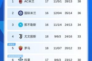 体育资讯01月04日讯 意甲第18轮,罗马客场0-1不敌亚特兰大降至第5,尤文1-1莱切成功升至第4,最新积分榜如下:
