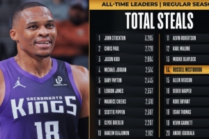 目前,威少已经送出了1次抢断,他的常规赛生涯抢断总数突破2000大关,历史第14人。