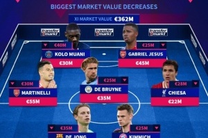 中场:德容(8000万欧→4500万欧)、基米希(7500万欧→5000万欧)、马丁内利(8500万欧→5500万欧)、德布劳内(6000万欧→3500万欧)、基耶萨(5000万欧→2200万欧)