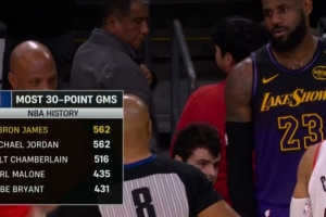 詹姆斯562场30+追平乔丹,科比431场第五