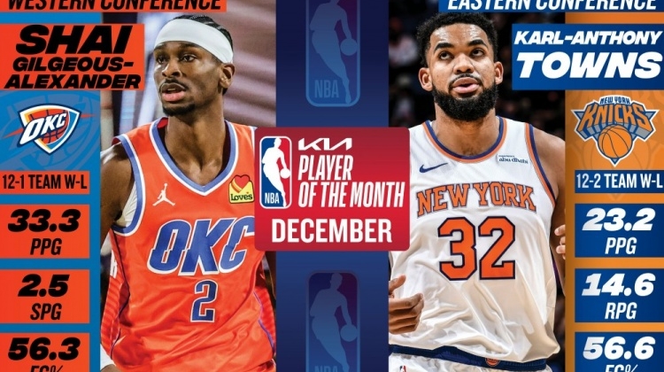 体育资讯1月3日讯 今日NBA官方宣布,雷霆球星亚历山大和尼克斯球星唐斯分别当选为12月西部和东部月最佳球员。