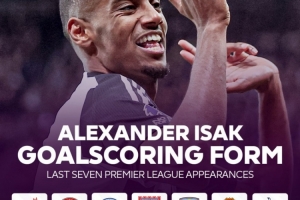 近期,伊萨克状态正佳,他已经连续7场联赛都有进球入账,在这7场比赛中打进了9球。英超官方也晒出海报:伊萨克进球停不下来!