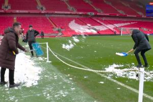 比赛开始前的几个小时,天空体育评论员卡拉格和内维尔已经抵达安菲尔德现场。卡拉格作为利物浦名宿首当其冲拿起铁锹为自己的主队清理场内积雪,而曼联名宿内维尔则将场外积雪往场内铲。两人你来我往场面过于滑稽。