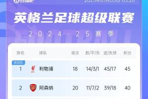 体育资讯01月05日讯 英超第20轮,阿森纳1-1战平布莱顿,切尔西1-1战平水晶宫,利物浦得以少赛2场的情况下5分领跑。