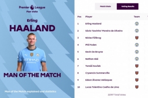 赛后,本场比赛打进2球的哈兰德当选全场最佳球员,他获得了46.8%得票率。