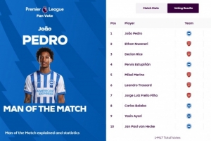 英超官网宣布,若昂-佩德罗获得47.7%得票率,当选全场最佳球员。