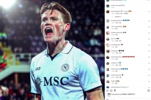 麦克托米奈赛后在Instagram晒图庆祝胜利,而前曼联队长马奎尔则点赞了动态,并评论道:“又进球了🔥👏”