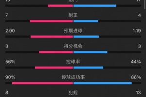 体育资讯1月5日讯 在刚刚结束的英超第20轮比赛中,曼城4-1击败西汉姆,取得两连胜。从数据统计中来看,曼城全场射门次数少于西汉姆,但射正次数更多。两队的绝佳机会和控球率相当,角球数则是7-1。