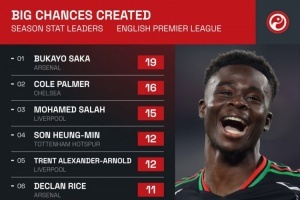 体育资讯1月6日讯 Squawka统计了球员本赛季在英超创造重大机会的次数,并列出榜单,缺席近3场联赛的萨卡仍以16场创造19次重大机会领跑,帕尔默创造16次重大机会排名次席。