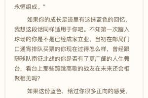 如果你的成长足迹里有这抹蓝色的回忆,我想这段话同样适用于你吧。不知第一次踏入球场的你是不是已经成家立业,当初在邮局门口通宵排队买票的你现在过得怎么样,曾经跟随球队南征北战的你是否有了更广阔的人生舞台,看台上那些蹦跳高歌的战友在未来还会相聚相见吗?