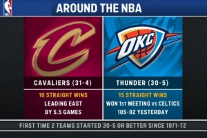 目前骑士31胜4负(10连胜)、雷霆30胜5负(15连胜)。这是联盟自1971-72赛季以来首次出现两支在赛季前35场取得至少30胜的球队。后天两队将正面交锋。