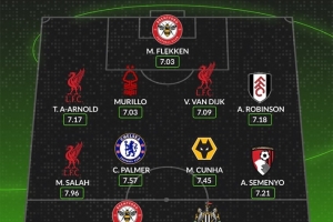 中场/边锋:萨拉赫(利物浦)、帕尔默(切尔西)、库尼亚(狼队)、塞梅诺(伯恩茅斯)