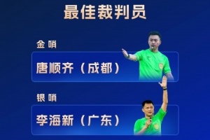 体育资讯1月8日讯 在2024赛季颁奖典礼中,中超官方公布了最佳裁判员奖前三名的获得者。位列金哨位置的是成都足协的唐顺齐,银哨是广东足协的李海新,而江苏足协的马宁则是铜哨。