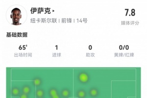 体育资讯1月8日讯 正在进行的英联杯,阿森纳主场0-2落后纽卡。此役伊萨克首发65分钟被换下,球员全场重点数据如下↓