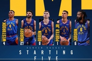 赛前掘金公布了本场首发:威少、穆雷、布劳恩、小迈克尔-波特、小乔丹