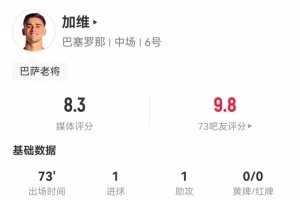 传射建功!加维本场数据:2射1正,3次关键传球,评分8.3